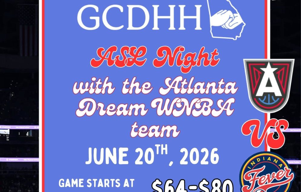 Join GCDHH for ASL Night with the Atlanta Dream — Dream vs. Indiana Fever on June 20, 2026 at 1 PM, State Farm Arena, Atlanta. Tickets $64–$80, exclusive ASL shirt included with every seat.