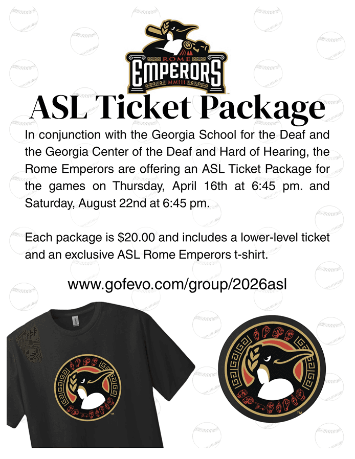 In conjunction with the Georgia School for the Deaf and GCDHH, the Rome Emperors are offering an ASL Ticket Package for the games on Thursday, April 16 at 6:45 pm. and Saturday, August 22 at 6:45 pm.