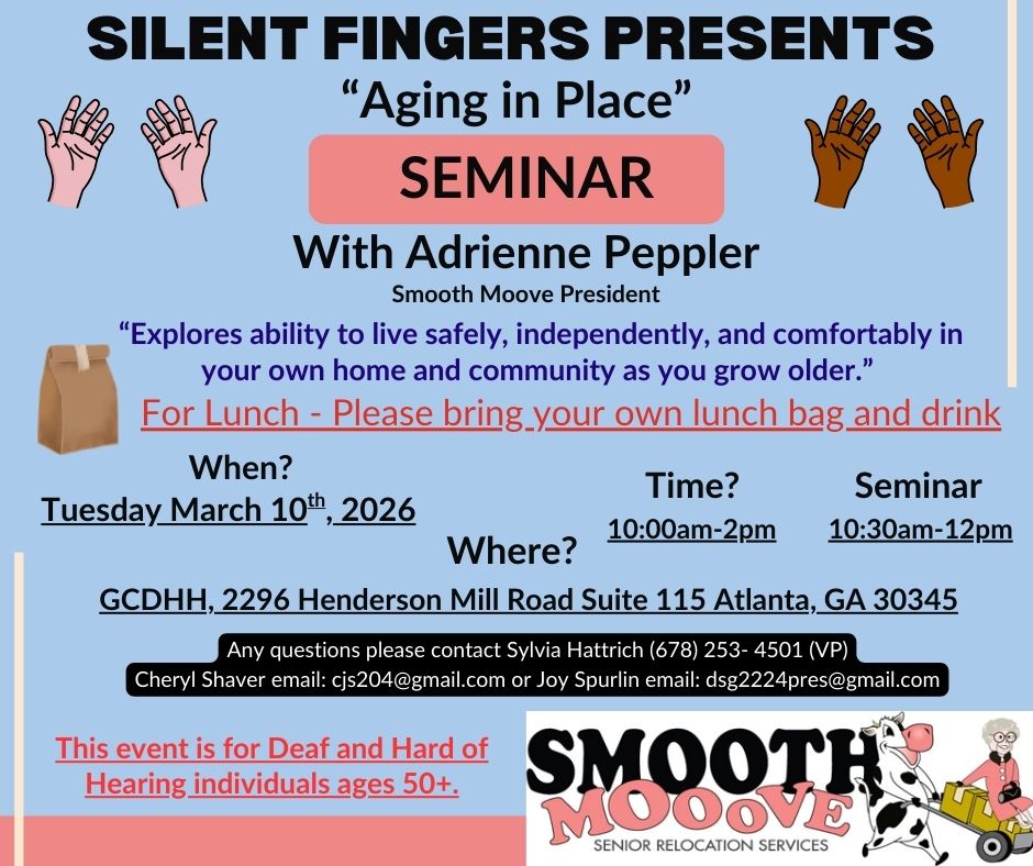SILENT FINGERS "Aging in Place" seminar with Adrienne Peppler (Smooth Moove) for Deaf/HoH ages 50+. Tue Mar 10, 2026, 10am-2pm at GCDHH Atlanta. Bring your own lunch & drink.