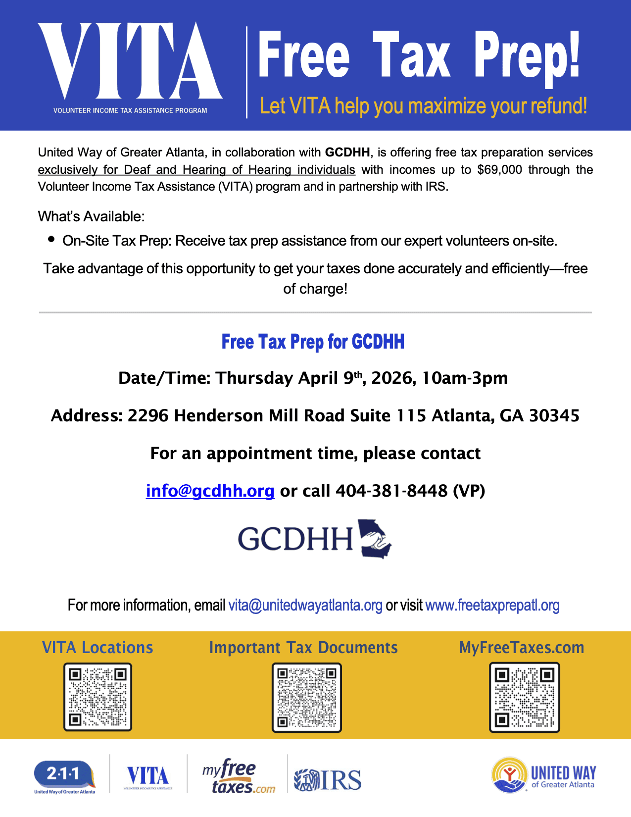 United Way of Greater Atlanta, in collaboration with GCDHH, is offering free tax preparation services exclusively for Deaf and Hearing of Hearing individuals with incomes up to $69,000 through the Volunteer Income Tax Assistance (VITA) program and in partnership with IRS.